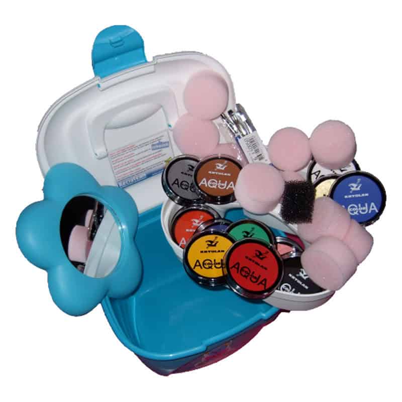 – 12 potjes PartyXplosion-aquaschmink van 30g: wit, zwart, licht bruin, donker geel, k. blauw, groen, felrood, roze/pink, oranje, paars, zilver, goud.